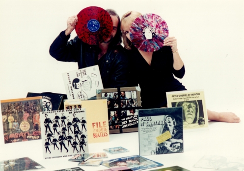 The picture of Vicky and me was taken at a photo shoot around 1994 after we ended our bootleg careers, for a project Jim Washburn was working on about Orange County bootleggers. The bootlegs in front of me are not necessarily ones I made. I think the only one I brought to the shoot was the (Rolling Stones) 'Nancy' cover. I loved Nancy and used her cartoon image frequently on my boots. The rest of them were already on the set when I got there. They probably were from Jim's collection. We were supposed to hide our faces behind the records, but we both kept peeking around them 'cause, you know, it was fun.