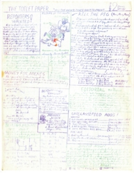 Orange County was the hotbed for right-wing, racist organizations in Southern California back then. You couldn't swing a dead cat without hitting some sort of hate group. We had The John Birch Society, The American White Peoples Sociailist Party, The United Members of the Klu Klux Klan, and The Tustin News, all in our backyard. All of these groups had members sitting on the Tustin School Board, so its not hard to imagine the type of curriculum we were getting in the classroom. They hated everyone and everything but mostly they hated communists, hippies and modern music, which in their eyes were indistinguishable. And of course they hated blacks and mexicans. That goes without saying. Larry and I were suspended from classes multiple times for "looking like a hippie". Which meant we had to go home, get a haircut, and have our parents promise they would try to keep us from looking like communists in the future, before we could return to class. To Larry and I, our enemies were obvious, and just begging for a slap down. Since our "starring" roles in the school play failed to ignite the Beatlemania response we were hoping for from the girls in our school, we knew we had to up our game.In the late 60's and early 70's so-called Underground Newspapers were springing up all over the country. They all strived to print alternative narratives to whatever the mainstream press was churning out. Larry and I figured we could do our own underground school newspaper and have some fun. We called it 'The Toilet Paper', and filled it with cartoons, satirical diatribes and articles which were all libelous, profane, or obscene in nature. The students loved it. Not so much the faculty and administration.
