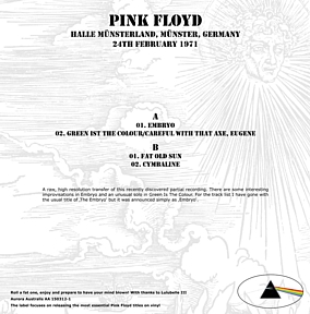 COMMENTS: EUROPEAN BOOTLEG IN DELUXE COVER. 409 COPIES PRESSED - 110 EACH OF RED, BLUE & YELLOW VINYL, 59 COPIES ON BLACK AND WHITE MARBLE VINYL, AND 20 BLACK TEST PRESSINGS. THERE ARE A FEW RARE COLOUR VARIATIONS (PURPLE AND OLIVE COLOUR VINYL) - THESE ARE SAID TO BE FROM THE COLOUR CHANGING PROCESS DURING PRESSING. THE LAST 2 PICS SHOW A FAKE COLOURED VINYL TEST PRESSING - THIS IS SIMPLY THE REGULAR ISSUE PUT IN A PLAIN COVER WITH WHITE STAMPED LABELS STUCK OVER THE REGULAR ONES BY SOME ANGEL IN ITALY.